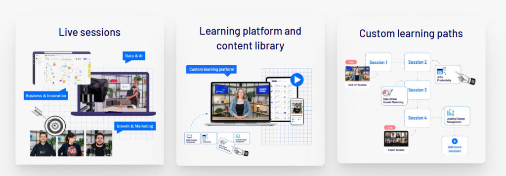| Program structure | Single courses, comprehensive minidegrees (50–80 hours), and live cohort sessions | On-demand certificates for individuals and teams; live virtual sessions, and interactive workshops designed for team learning |