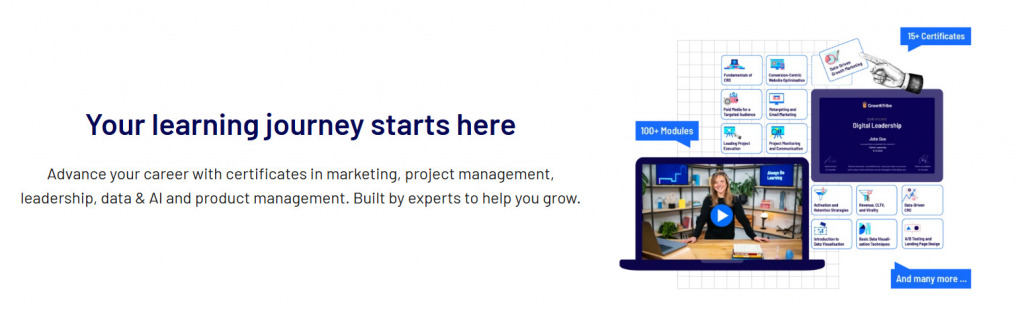 Growth Tribe focuses on interactive, team-oriented learning experiences. Their on-demand certificates work for individual skill building, but the platform really shines with live virtual sessions and interactive workshops designed for teams.