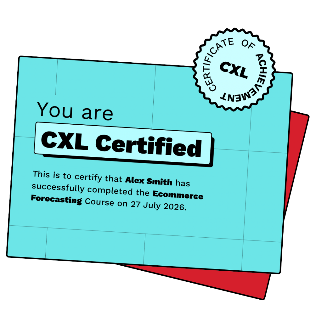 Completing this course earns you an official CXL Ecommerce Forecasting Course Certificate to prove your achievement. CXL is recognized as an industry-leading qualification by employers worldwide, and it is an official qualification on LinkedIn that can be added to your profile.